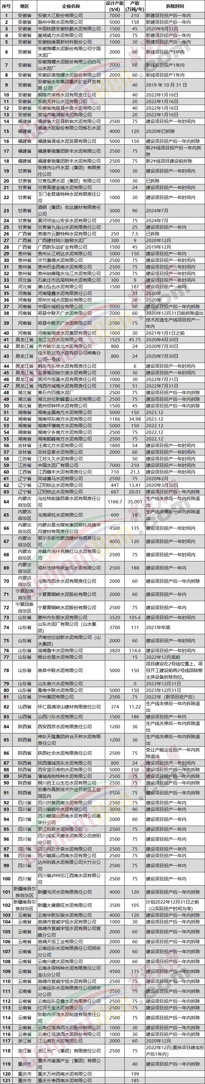 部分淘汰水泥生產(chǎn)線拆除時間表