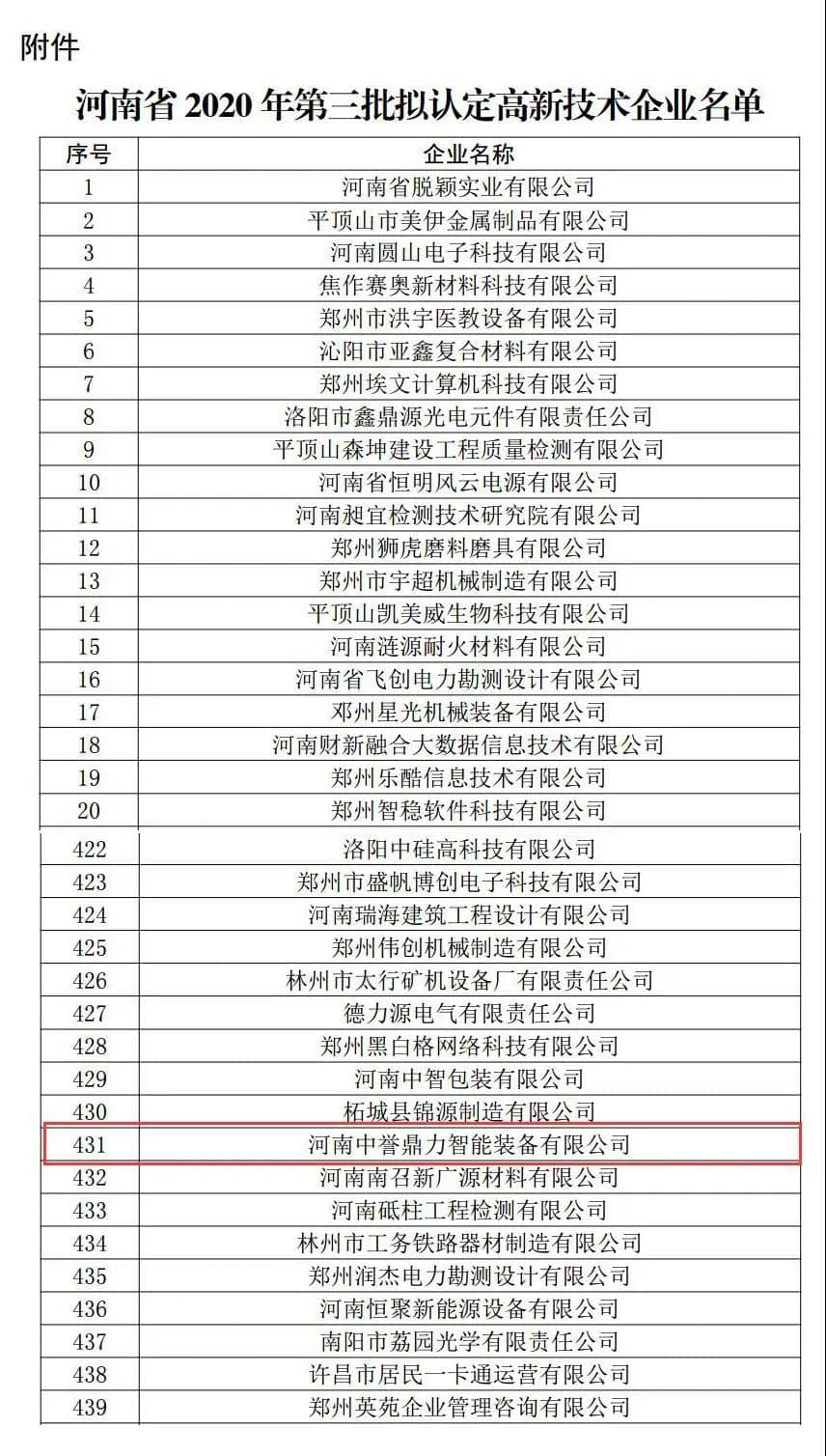 根據國家《高新技術企業(yè)認定管理辦法》(國科發(fā)火〔2016〕32號)和《高新技術企業(yè)認定管理工作指引》(國科發(fā)火〔2016〕195號)有關規(guī)定,全國高新技術企業(yè)認定管理工作領導小組辦公室12月初在官方網站對河南省2020年第三批擬認定高新技術企業(yè)名單進行公示。經過為期10天的公示階段,河南中譽鼎力智能裝備有限公司順利通過“國家高新技術企業(yè)”認定。
