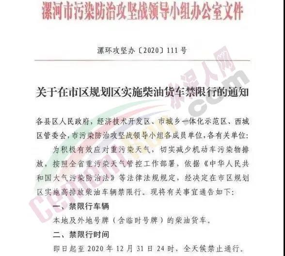 12月14日,河南省漯河市污染防治攻堅(jiān)戰(zhàn)領(lǐng)導(dǎo)小組辦公室發(fā)布通知,即日起至2020年12月31日24時,在城市規(guī)劃區(qū)內(nèi)的所有道路(不含高速公路)禁止所有柴油貨車通行。確需在禁限行區(qū)內(nèi)通行的,需拿到相關(guān)通行證,并且車輛應(yīng)達(dá)到國五及以上排放標(biāo)準(zhǔn)要求,否則將依法予以處罰并予以公開曝光。