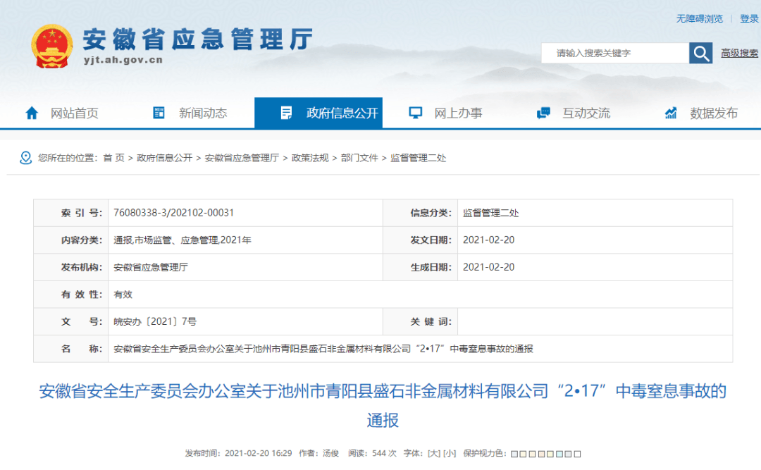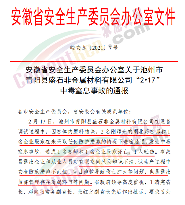 日前,安徽省應(yīng)急管理廳發(fā)布《安徽省安全生產(chǎn)委員會(huì)辦公室關(guān)于池州市青陽縣盛石非金屬材料有限公司“2•17”中毒窒息事故的通報(bào)》。