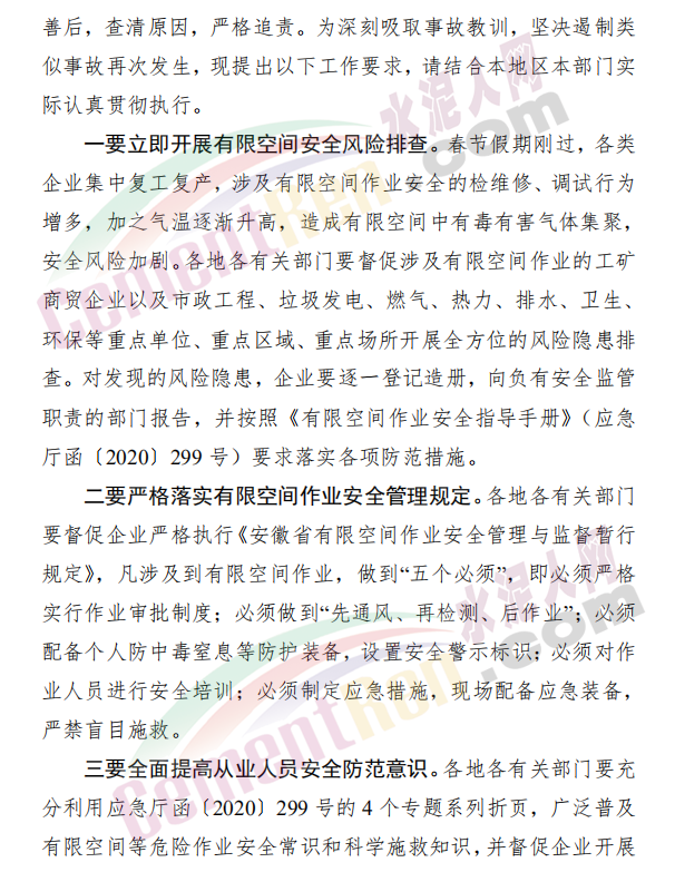 春節(jié)假期剛過,各類企業(yè)集中復(fù)工復(fù)產(chǎn),涉及有限空間作業(yè)安全的檢維修、調(diào)試行為增多,加之氣溫逐漸升高,造成有限空間中有毒有害氣體集聚,安全風(fēng)險(xiǎn)加劇。各地各有關(guān)部門要督促涉及有限空間作業(yè)的工礦商貿(mào)企業(yè)以及市政工程、垃圾發(fā)電、燃?xì)?、熱力、排水、衛(wèi)生、環(huán)保等重點(diǎn)單位、重點(diǎn)區(qū)域、重點(diǎn)場(chǎng)所開展全方位的風(fēng)險(xiǎn)隱患排查。對(duì)發(fā)現(xiàn)的風(fēng)險(xiǎn)隱患,企業(yè)要逐一登記造冊(cè),向負(fù)有安全監(jiān)管職責(zé)的部門報(bào)告,并按照《有限空間作業(yè)安全指導(dǎo)手冊(cè)》(應(yīng)急廳函〔2020〕299號(hào))要求落實(shí)各項(xiàng)防范措施。