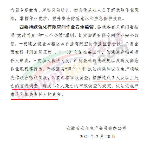 各地各有關(guān)部門要按照“黨政同責(zé)”和“三個(gè)必須”原則,切實(shí)加強(qiáng)有限空間作業(yè)安全監(jiān)管。一要建立健全本轄區(qū)本行業(yè)有限空間作業(yè)監(jiān)管臺(tái)帳。二要全面做好《刑法修正案(十一)》實(shí)施準(zhǔn)備工作,依法追究相關(guān)責(zé)任人刑責(zé)。三要加大執(zhí)法力度,嚴(yán)厲查處違法違規(guī)以及違反高危作業(yè)規(guī)程等行為,嚴(yán)格落實(shí)“四個(gè)一律”執(zhí)法措施和安全生產(chǎn)領(lǐng)域失信聯(lián)合懲戒制度。四要嚴(yán)格事故調(diào)查,按照造成3人及以上死亡的省級(jí)調(diào)查,造成1-2人死亡的市級(jí)調(diào)查的規(guī)定,依法依規(guī)嚴(yán)肅追究相關(guān)責(zé)任人的責(zé)任。
