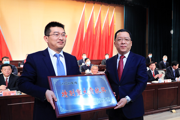 2月18日上午,銅陵市政府組織召開全市雙招雙引暨重大項目攻堅年動員大會。市委書記丁純同志出席會議并講話,市委副書記、市長胡啟生同志主持會議。大會首次對全市有突出貢獻的、發(fā)展快的、質(zhì)態(tài)好的企業(yè)進行了星級評定和表彰。銅陵海螺榮獲“特別重大貢獻獎”“畝均效益貢獻獎”“五星級企業(yè)”稱號,公司總經(jīng)理劉慶新同志榮獲“明星企業(yè)家”稱號,并代表公司接受市委書記丁純同志的現(xiàn)場授牌。