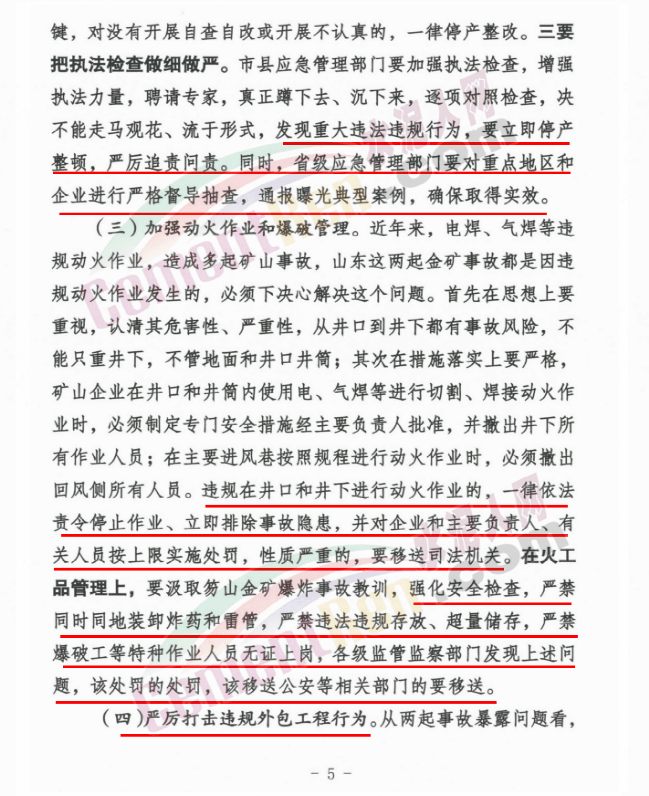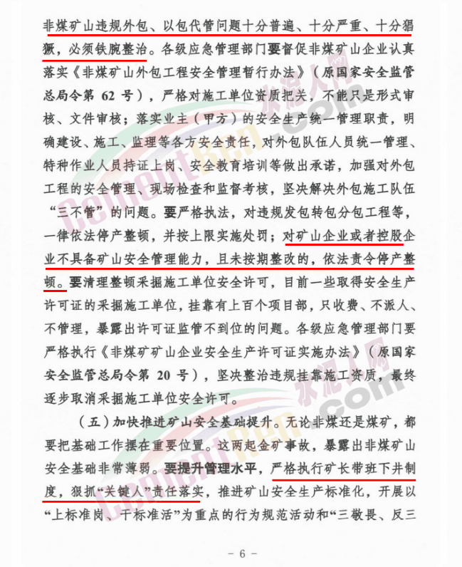 針對(duì)于礦山事故多發(fā),國(guó)務(wù)院及應(yīng)急管理部相關(guān)領(lǐng)導(dǎo)要求以清理整治違規(guī)外包隊(duì)伍為突破口,立即組織對(duì)地下非煤礦山和尾礦庫(kù)開(kāi)展全系統(tǒng)各環(huán)節(jié)大排查,做到高風(fēng)險(xiǎn)礦山自查自改、上級(jí)企業(yè)檢查下級(jí)礦山、市縣監(jiān)管部門(mén)督查礦山“三個(gè)百分百”。
