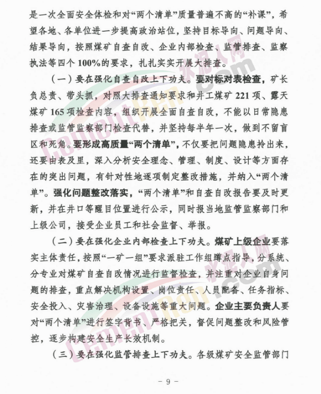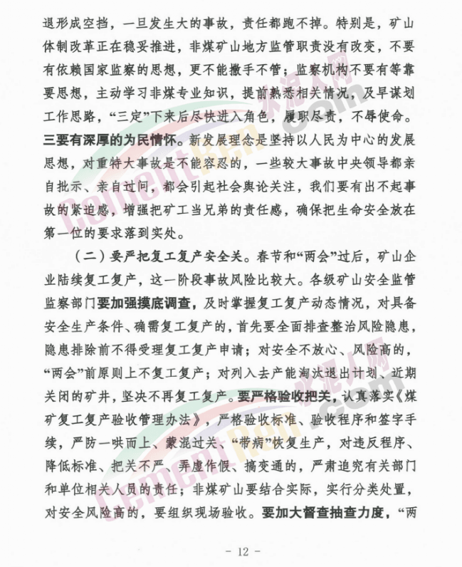 要全面深入開(kāi)展煤礦安全生產(chǎn)大排查,深刻認(rèn)識(shí)其重要性和緊迫性,在強(qiáng)化自查自改、企業(yè)內(nèi)部檢查、監(jiān)管排查、監(jiān)察執(zhí)法上下功夫,確保取得實(shí)實(shí)在在的成效。要統(tǒng)籌兼顧做好各方面工作,著力轉(zhuǎn)變思想觀念,錘煉隊(duì)伍過(guò)硬作風(fēng),嚴(yán)把節(jié)后復(fù)工復(fù)產(chǎn)安全關(guān),為全年工作起好步、開(kāi)好局。