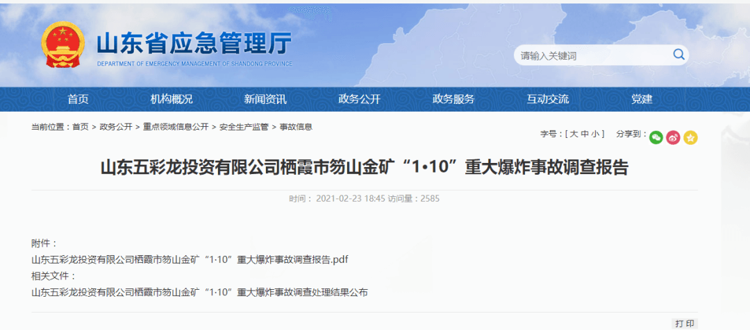 23日,山東省應(yīng)急管理廳在其官網(wǎng)公布山東五彩龍投資有限公司棲霞市笏山金礦“1·10”重大爆炸事故調(diào)查報告全文。