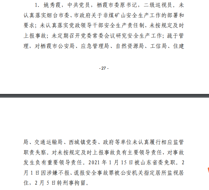 姚秀霞,棲霞市委原書記,二級巡視員。未認(rèn)真落實煙臺市委、市政府關(guān)于非煤礦山安全生產(chǎn)工作的部署和要求;未認(rèn)真落實黨政領(lǐng)導(dǎo)干部安全生產(chǎn)責(zé)任制,未按規(guī)定及時上報事故;未定期召開黨委常委會議研究安全生產(chǎn)工作;疏于管理,對棲霞市公安局、應(yīng)急管理局、自然資源局、工信局、住建局、交通運輸局、西城鎮(zhèn)黨委、政府等單位未認(rèn)真履行相應(yīng)監(jiān)管職責(zé)失察。對未按規(guī)定及時上報事故負(fù)有主要領(lǐng)導(dǎo)責(zé)任,對事故發(fā)生負(fù)有重要領(lǐng)導(dǎo)責(zé)任。2021年1月15日被山東省委免職。2月1日因涉嫌不報、謊報安全事故罪被公安機(jī)關(guān)指定居所監(jiān)視居住,2月5日轉(zhuǎn)刑事拘留。