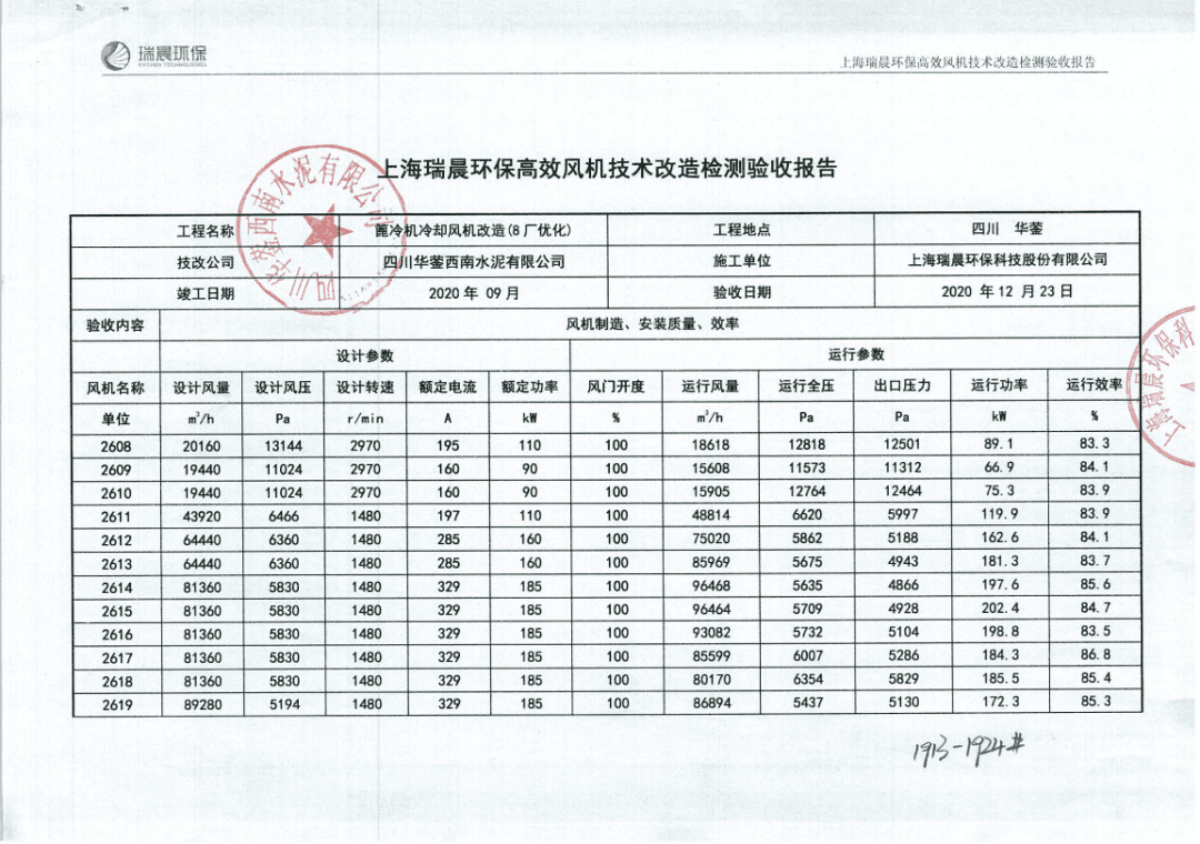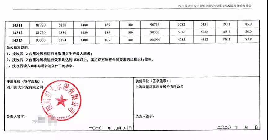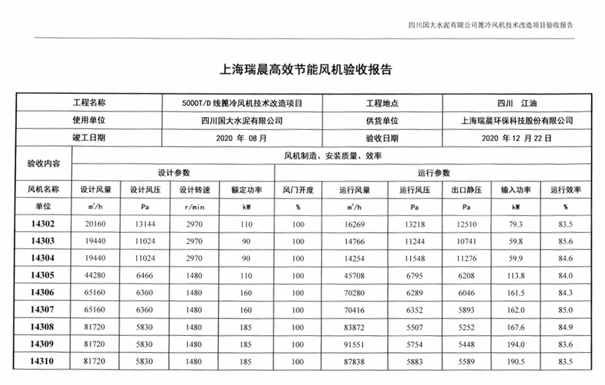 經(jīng)瑞晨環(huán)保改造后,華鎣西南12臺高效篦冷風機2608-2619運行穩(wěn)定,經(jīng)第三方(綿陽旗諾)檢測,運行效率分別高達83.30%、84.10%、83.90%、83.90%、84.10%、83.70%、85.60%、84.70%、83.50%、86.80%、85.40%、85.30%,并在熟料提產(chǎn)至6560t/d后12臺高效篦冷風機噸熟料電耗降低至4.13kWh/t,篦冷機系統(tǒng)噸熟料電耗降低至4.30kWh/t,滿足技術(shù)合同約定的篦冷機系統(tǒng)噸熟料電耗≤4.73kWh/t。瑞晨環(huán)保高效篦冷風機配合成都院配套IKN第四代篦冷床的升級換代項目完美驗收,瑞晨環(huán)保高效篦冷風機得到成都院與四川華鎣西南水泥有限公司各層領(lǐng)導以及西南水泥高層的高度認可與一致好評。