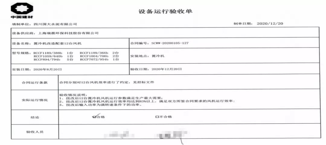 瑞晨環(huán)保高效篦冷風機配合凱盛院配套IKN第四代篦冷床的升級換代項目完美驗收,得到凱盛院與四川國大水泥有限公司各層領(lǐng)導以及西南水泥高層的高度認可與一致好評。