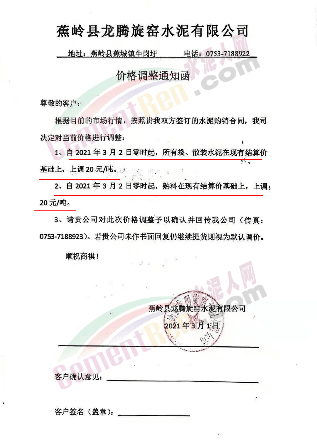 根據(jù)目前市場情況,經(jīng)公司研究,決定從2021年3月2日零時(shí)起,本公司發(fā)往廣東省內(nèi)各品種各規(guī)格型號(hào)水泥、熟料在原價(jià)格基礎(chǔ)上上調(diào)20元/噸。