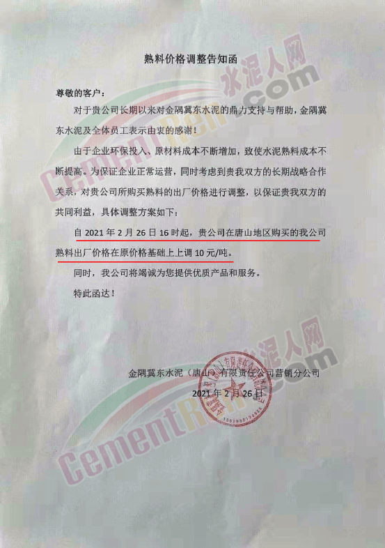 依照《水泥購銷合同》的約定,因原、燃材料大幅上漲,經(jīng)公司研究決定,自2021年3月2日零時(shí)起,發(fā)往廣東方向所有品種等級(jí)水泥、熟料出廠結(jié)算價(jià)格分別在現(xiàn)行價(jià)格基礎(chǔ)上上調(diào)20元/噸。感謝您的理解與支持!