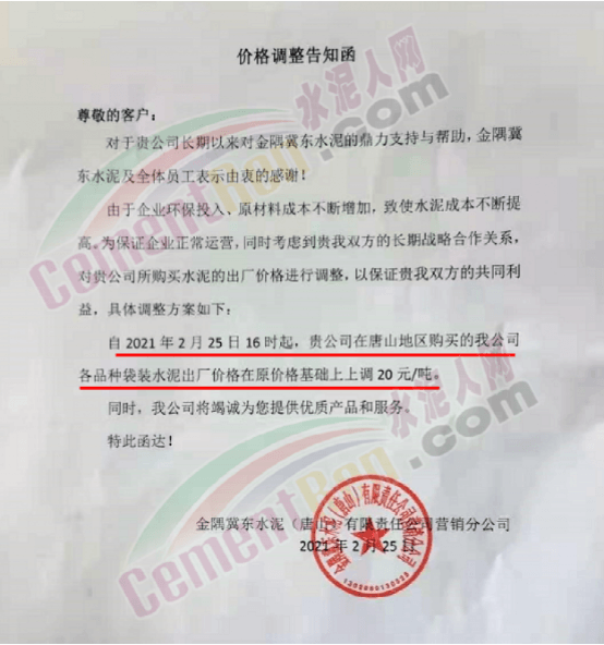 根據(jù)當(dāng)前市場情況的變化,經(jīng)公司研究決定:從2021年3月2日零時(shí)起,各品種等級(jí)袋/散裝水泥及旋窯熟料分別在原價(jià)格基礎(chǔ)上上調(diào)20元/噸。不便之處,敬請(qǐng)諒解。