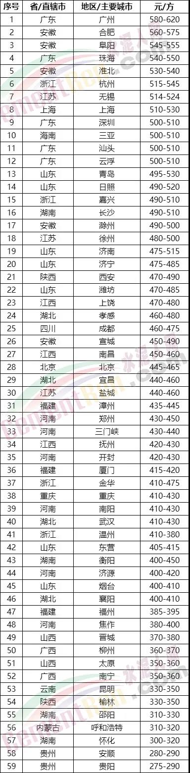 混凝土方面,報(bào)價(jià)相對(duì)較高的區(qū)域在華南珠三角及周邊以及華東長三角及周邊區(qū)域,報(bào)價(jià)多在500-650元/方之間;價(jià)格相對(duì)較低的區(qū)域?yàn)槲髂显颇?、貴州、廣西和山西地區(qū),均價(jià)多在400元/方以下,其中貴州貴陽地區(qū)報(bào)價(jià)275-290元/方。
