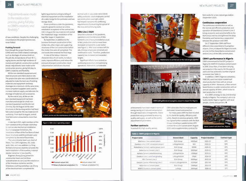 國際水泥評論- International Cement Review雜志是世界水泥業(yè)界的權(quán)威期刊。文章指出,在全球疫情肆虐,海外環(huán)境復(fù)雜艱難的背景之下,中材建設(shè)尼日利亞在建項(xiàng)目SOKOTO3線不辱使命,出色完成了各項(xiàng)工作,贏得了業(yè)主的高度信任;生產(chǎn)運(yùn)營項(xiàng)目EDO兩條6000T/D生產(chǎn)線和SOKOTO一條3300T/D生產(chǎn)線,維穩(wěn)保產(chǎn),運(yùn)營成績再創(chuàng)新高。