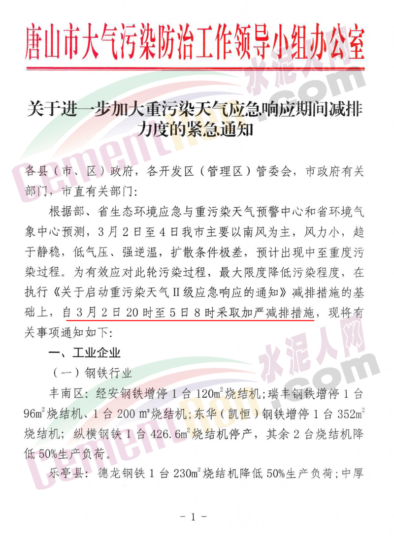 據(jù)水泥人網(wǎng)了解:日前,唐山市大氣污染防治工作領(lǐng)導小組辦公室發(fā)布《關(guān)于進一步加大重污染天氣應急響應期間減排力度的緊急通知》稱,根據(jù)部、省生態(tài)環(huán)境應急與重污染天氣預警中心和省環(huán)境氣象中心預測,3月2日至4日唐山市主要以南風為主,風力小,趨于靜穩(wěn),低氣壓、強逆溫,擴散條件極差,預計出現(xiàn)中至重度污染過程。