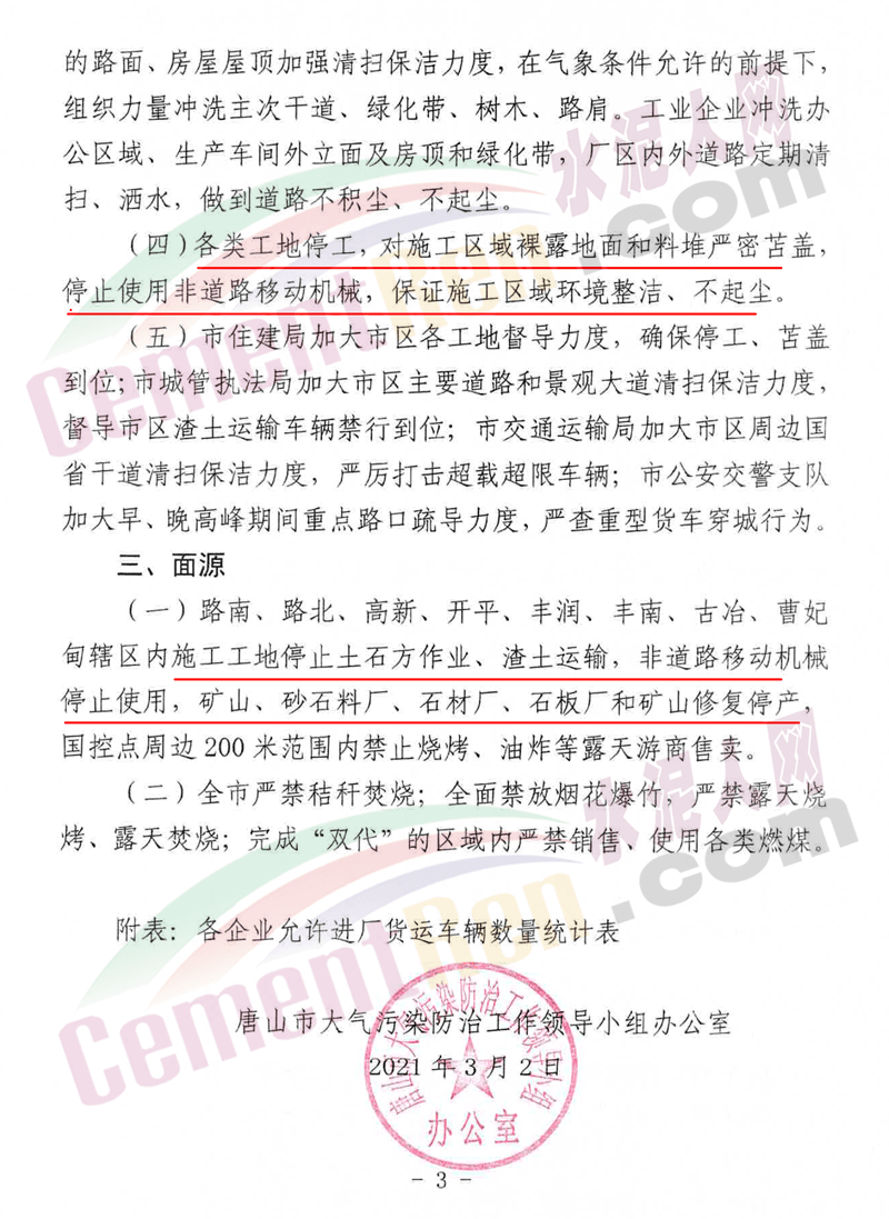 面源:路南、路北、高新、開平、豐潤、豐南、古冶、曹妃甸轄區(qū)內(nèi)施工工地停止土石方作業(yè)、渣土運輸,非道路移動機械停止使用,礦山、砂石料廠、石材廠、石板廠和礦山修復停產(chǎn)。