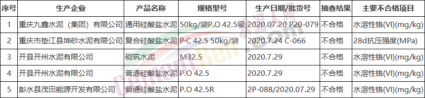 不合格水泥名單顯示,不合格企業(yè)包括重慶九鑫水泥(集團(tuán))有限公司、重慶市墊江縣坤砂水泥有限公司、開縣開州水泥有限公司、彭水縣茂田能源開發(fā)有限公司等四家企業(yè)5個(gè)批次,其中42.5級水泥4個(gè)批次,32.5級水泥1個(gè)批次,生產(chǎn)日期均為2020年7月份。
