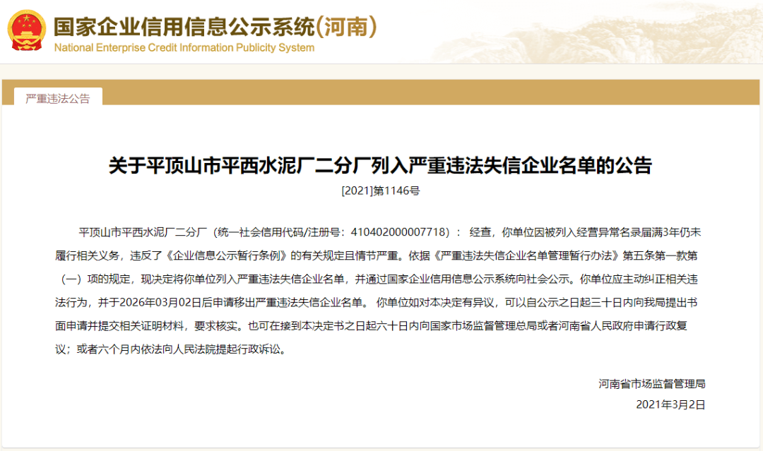 日前,水泥人網(wǎng)從國家企業(yè)信用信息公示系統(tǒng)獲悉,2021年3月2日,河南省市場監(jiān)督管理局發(fā)布關于平頂山市平西水泥廠二分廠列入嚴重違法失信企業(yè)名單的公告([2021]第1146號)。