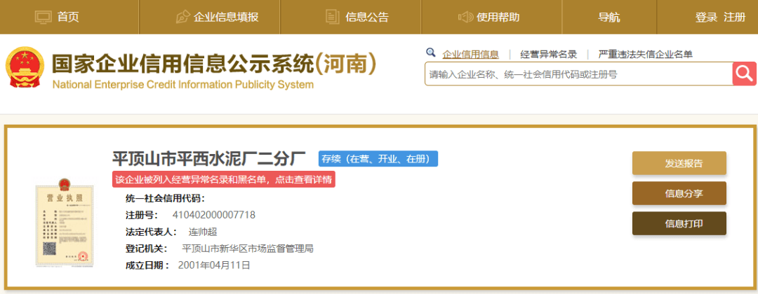 經(jīng)查,平頂山市平西水泥廠二分廠(統(tǒng)一社會信用代碼/注冊號:410402000007718)因被列入經(jīng)營異常名錄屆滿3年仍未履行相關義務,違反了《企業(yè)信息公示暫行條例》的有關規(guī)定且情節(jié)嚴重。依據(jù)《嚴重違法失信企業(yè)名單管理暫行辦法》第五條第一款第(一)項的規(guī)定,河南省市場監(jiān)督管理局現(xiàn)決定將平頂山市平西水泥廠二分廠列入嚴重違法失信企業(yè)名單,并通過國家企業(yè)信用信息公示系統(tǒng)向社會公示。