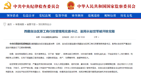 1月8日,中央紀(jì)委國家監(jiān)委網(wǎng)站消息《西藏自治區(qū)原工商行政管理局黨委書記、副局長趙世軍被開除黨籍》。
