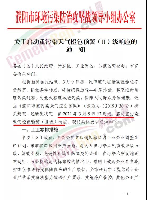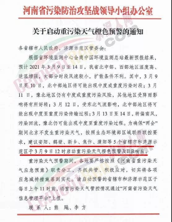 濮陽市環(huán)境污染防治攻堅戰(zhàn)領(lǐng)導小組辦公室發(fā)布《關(guān)于啟動重污染天氣橙色預警(Ⅱ)級響應的通知》自2021年3月9日12時起,啟動重污染天氣橙色預警(Ⅱ級)響應。