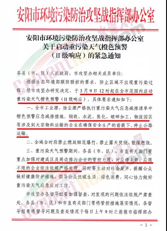 安陽市環(huán)境污染防治攻堅戰(zhàn)指揮部辦公室發(fā)布《關(guān)于啟動重污染天氣橙色預警(Ⅱ級響應)的緊急通知》,要求于3月9日12時在全市范圍內(nèi)啟動重污染天氣橙色預警(Ⅱ級響應)要求全市工業(yè)源、揚塵源嚴格執(zhí)行重污染天氣應急減排清單中橙色預警應急減排措施。