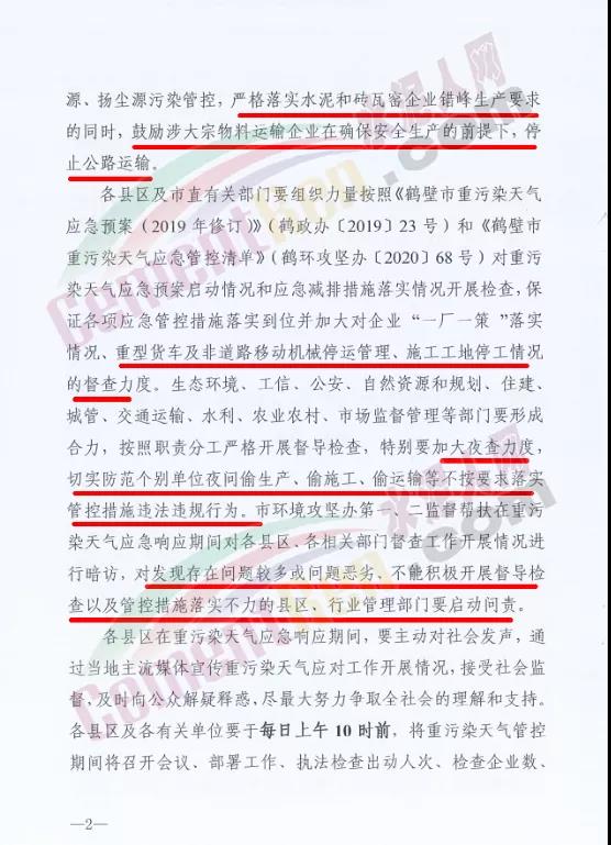 鶴壁市環(huán)境污染防治攻堅戰(zhàn)指揮部辦公室發(fā)布《關(guān)于啟動重污染天氣Ⅱ級(橙色)預警響應的通知》自2021年3月9日12時起啟動重污染天Ⅱ級(橙色)預警響應,解除時間另行通知。在重污染天氣預警期間,請各縣區(qū)在全面加強工業(yè)源、移動源、揚塵源污染管控,嚴格落實水泥和磚瓦窯企業(yè)錯峰生產(chǎn)要求的同時,鼓勵涉大宗物料運輸企業(yè)在確保安全生產(chǎn)的前提下,停止公路運輸。重型貨車及非道路移動機械停運管理、施工工地停工情況的督查力度。