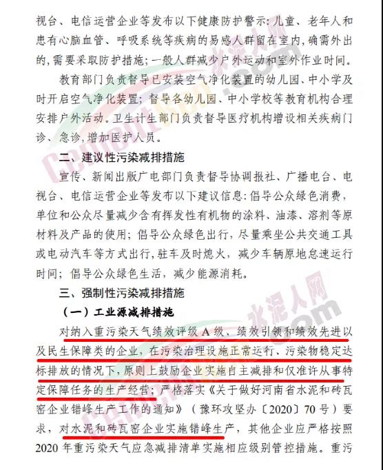 工業(yè)源減排措施要求對納入重污染天氣績效評級A級、績效引領(lǐng)和績效先進以及民生保障類的企業(yè),在污染治理設施正常運行、污染物穩(wěn)定達標排放的情況下,原則上鼓勵企業(yè)實施自主減排和僅準許從事特定保障任務的生產(chǎn)經(jīng)營;嚴格落實《關(guān)于做好河南省水泥和磚瓦窯企業(yè)錯峰生產(chǎn)工作的通知》(豫環(huán)攻堅辦〔2020〕70號)要求,對水泥和磚瓦窯企業(yè)實施錯峰生產(chǎn),其他企業(yè)應嚴格按照2020年重污染天氣應急減排清單實施相應級別管控措施。