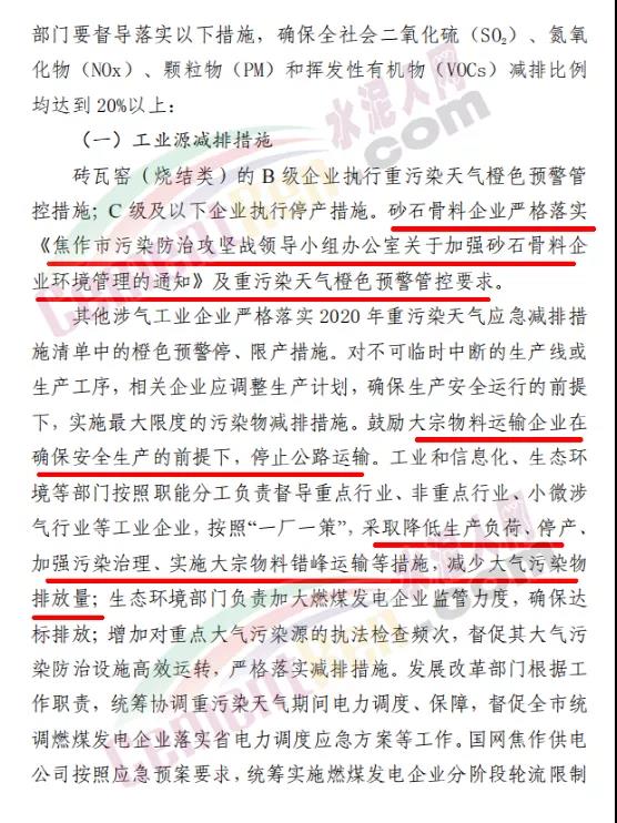 工業(yè)源減排措施要求磚瓦窯(燒結(jié)類)的B級企業(yè)執(zhí)行重污染天氣橙色預警管控措施;C級及以下企業(yè)執(zhí)行停產(chǎn)措施。砂石骨料企業(yè)嚴格落實《焦作市污染防治攻堅戰(zhàn)領(lǐng)導小組辦公室關(guān)于加強砂石骨料企業(yè)環(huán)境管理的通知》及重污染天氣橙色預警管控要求。