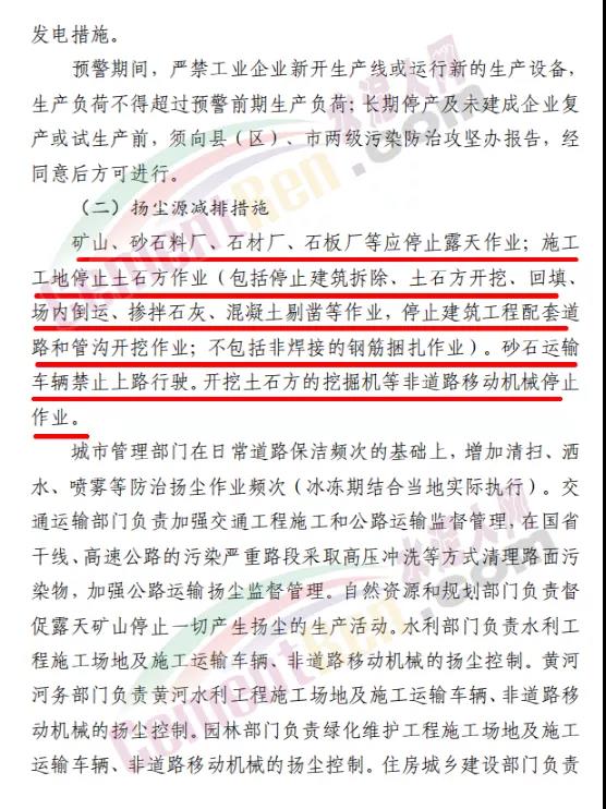 工業(yè)企業(yè)減排措施方面∶落實重污染天氣應急預案、應急減排清單確定的減排措施。揚塵污染減排措施方面∶礦山、砂石料場、石材廠、石板廠等停止露天作業(yè);施工工地禁止土石方作業(yè)、建筑拆除、噴涂粉刷、護坡噴漿、混凝土攪拌等;