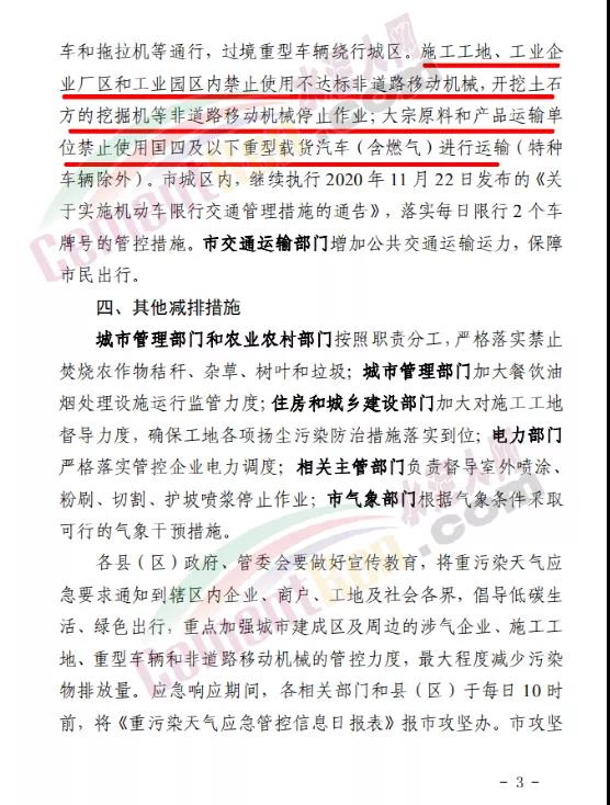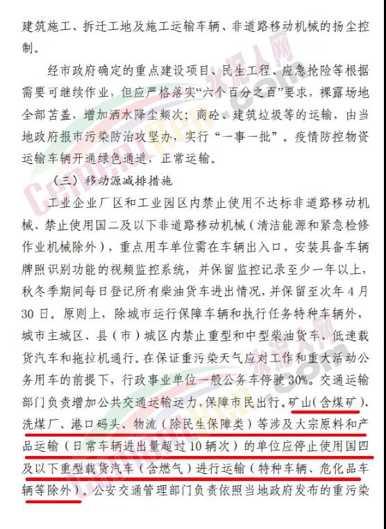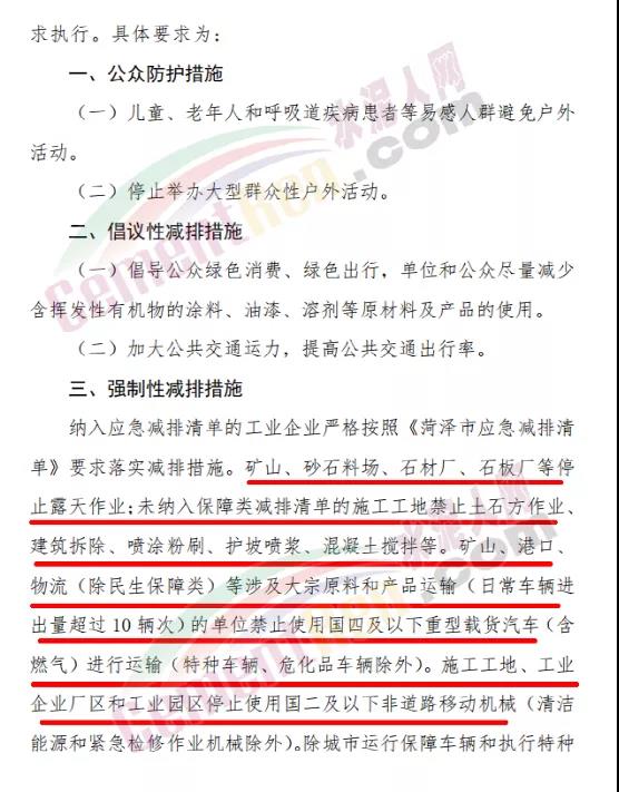強制性減排措施要求納入應急減排清單的工業(yè)企業(yè)嚴格按照《菏澤市應急減排清單》要求落實減排措施。礦山、砂石料場、石材廠、石板廠等停止露天作業(yè);未納入保障類減排清單的施工工地禁止土石方作業(yè)、建筑拆除、噴涂粉刷、護坡噴漿、混凝土攪拌等。礦山、港口、物流(除民生保障類)等涉及大宗原料和產(chǎn)品運輸(的單位禁止使用國四及以下重型載貨汽車進行運輸。施工工地、工業(yè)企業(yè)廠區(qū)和工業(yè)園區(qū)停止使用國二及以下非道路移動機械。