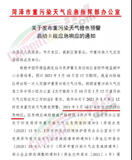 山東省菏澤市重污染天氣應急指揮部辦公室發(fā)布《關(guān)于發(fā)布重污染天氣橙色預警啟動Ⅱ級應急響應的通知》稱于2021年3月9日12時發(fā)布重污染天氣橙色預警,2021年3月10日0時啟動Ⅱ級應急響應。