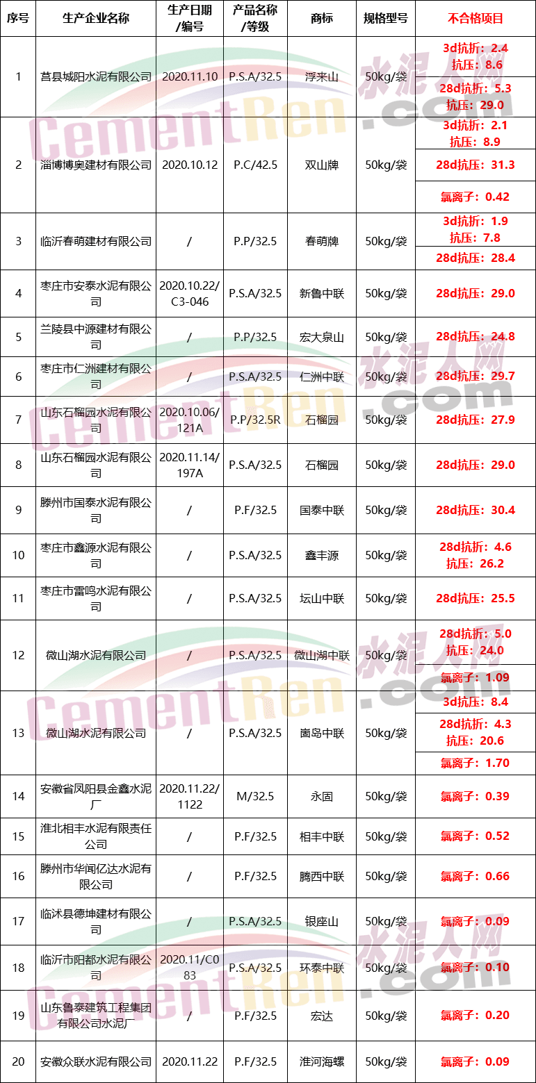 抽檢不合格水泥產(chǎn)品名單