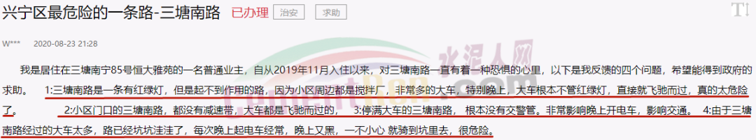 據(jù)水泥人網(wǎng)了解,上述兩家企業(yè)一家為水泥制品工廠,一家為商品混凝生產(chǎn)企業(yè)。且早在2020年5月27日,就有網(wǎng)友在人民網(wǎng)地方留言板給興寧區(qū)委書記留言稱,三塘南路盛天水泥24小時不間斷施工,噪音大、揚(yáng)塵多,業(yè)主不敢開窗。而且,混凝土車輛多,周邊道路沒有很好的提示標(biāo)志 ,道路兩側(cè)隔離帶種植樹木遮擋拐彎視線,車輛在此處極容易發(fā)生交通事故。