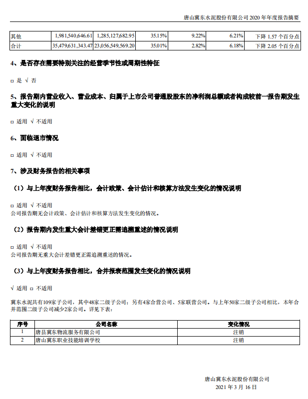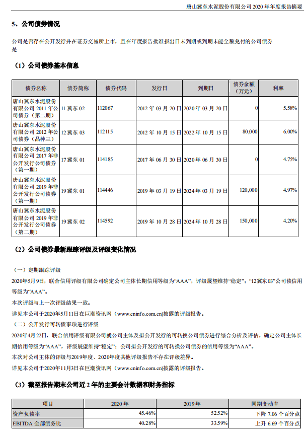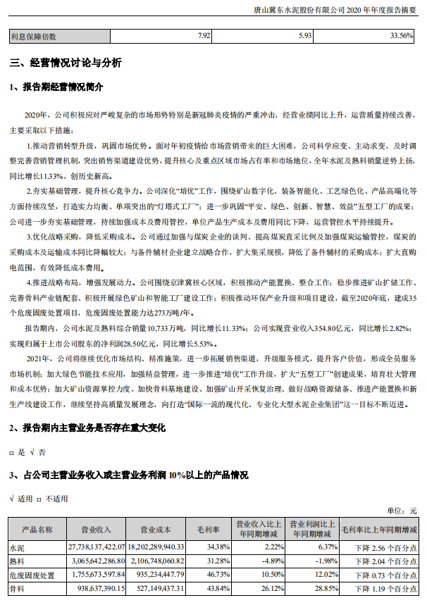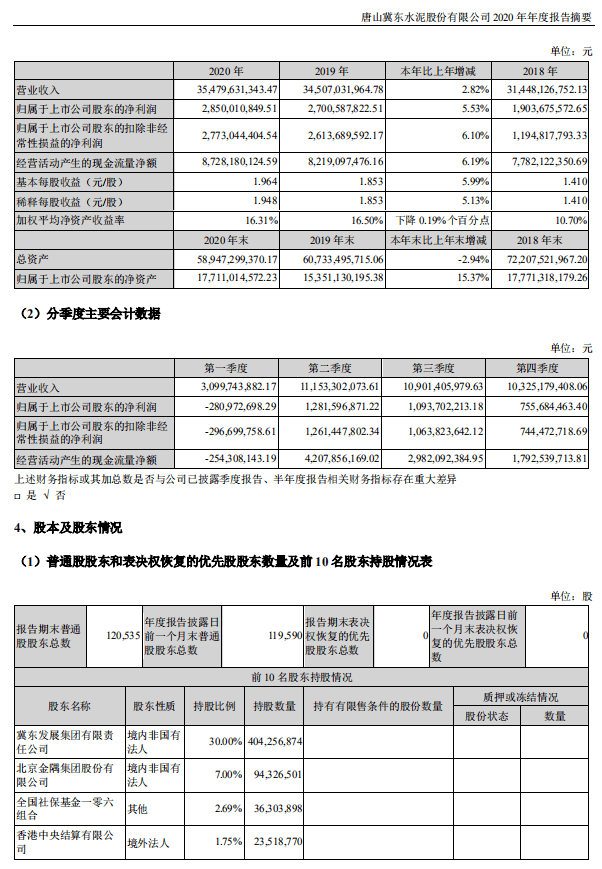 3月16日,冀東水泥發(fā)布了2020年年報。公司實現(xiàn)營業(yè)收入354.8億元,同比增長2.82%;凈利潤28.5億元,同比增長5.53%。公司水泥及熟料綜合銷量10733萬噸,同比增長11.33%。