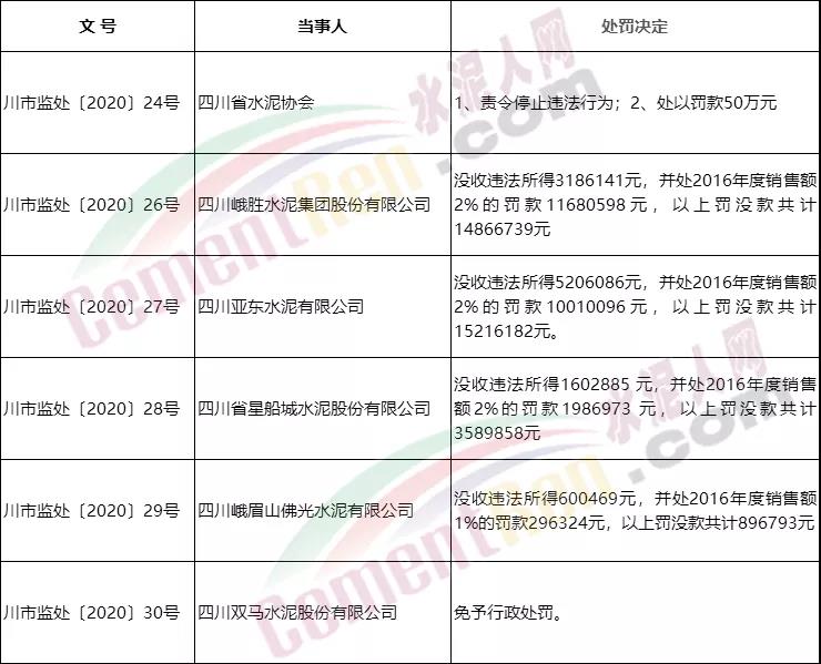 3月16日,四川省市場監(jiān)督管理局發(fā)布6條《行政處罰決定書》。其中針對于當(dāng)?shù)?a href="http://www.piarcos.com/news/list_1.html" target="_blank" class="keylink">水泥行業(yè)的處罰決定書提到案件來源及調(diào)查經(jīng)過為:2017年7月,四川省發(fā)展和改革委員會從多個途徑收到反映四川省水泥協(xié)會組織本行業(yè)經(jīng)營者聯(lián)合漲價的舉報。經(jīng)初步核查后,四川省發(fā)展和改革委員會于2017年7月20日正式對四川省水泥協(xié)會及涉嫌達成并實施壟斷協(xié)議 的六家水泥經(jīng)營者予以立案調(diào)查。