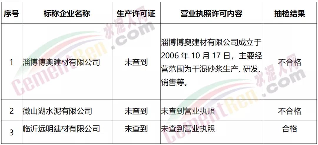 不合格的18家企業(yè)中兩家企業(yè)未查到生產(chǎn)許可證,其中微山湖水泥有限公司甚至查不到營業(yè)執(zhí)照。同時,在抽樣檢驗合格的企業(yè)中,水泥質量萬里行組委會發(fā)現(xiàn)1家無證生產(chǎn)企業(yè),2家生產(chǎn)許可證已過有效期(來源生產(chǎn)許可證辦公室,以實際證書為準)。