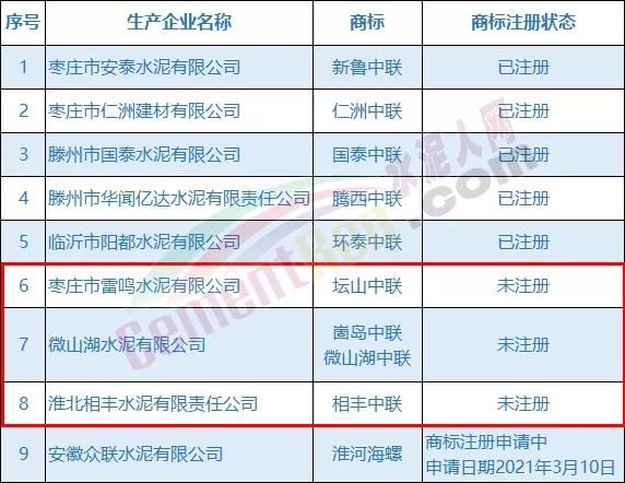 從不合格水泥品牌列表可見有9家企業(yè)為“高仿品牌”水泥。8家企業(yè)商標均帶有“中聯(lián)”字樣,其中5家商標狀態(tài)為已注冊3家未注冊。雖注冊為“中聯(lián)”卻非中國聯(lián)合水泥集團有限公司下屬企業(yè)。另一家企業(yè)商標中帶有“海螺”字樣,商標為申請注冊過程中,申請日期為上周三(2021年3月10日)也非安徽海螺水泥股份有限公司下屬企業(yè)。