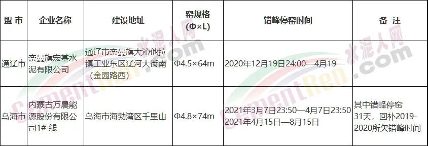 根據(jù)《內(nèi)蒙古自治區(qū)工業(yè)和信息化廳 生態(tài)環(huán)境廳關(guān)于2020—2021年采暖季水泥企業(yè)錯峰生產(chǎn)的通知》(內(nèi)工信原工字〔2020〕315號)相關(guān)要求,現(xiàn)將2020-2021年水泥熟料生產(chǎn)線錯峰停窯企業(yè)、錯峰置換停窯清單以及電石渣水泥熟料企業(yè)運行及停窯清單(第二批)予以公示,對不嚴格執(zhí)行錯峰生產(chǎn)或弄虛作假的企業(yè),按照文件要求我廳將會同生態(tài)環(huán)境廳推送至企業(yè)信用信息公示系統(tǒng)(內(nèi)蒙古)協(xié)同監(jiān)管平臺將其列入黑名單或嚴重違法失信企業(yè)名單,并對違法違規(guī)企業(yè)及其主要負責人實施聯(lián)合懲戒。公示期為2021年3月19日—25日。如有異議,請于公示期內(nèi)向工信廳反饋。