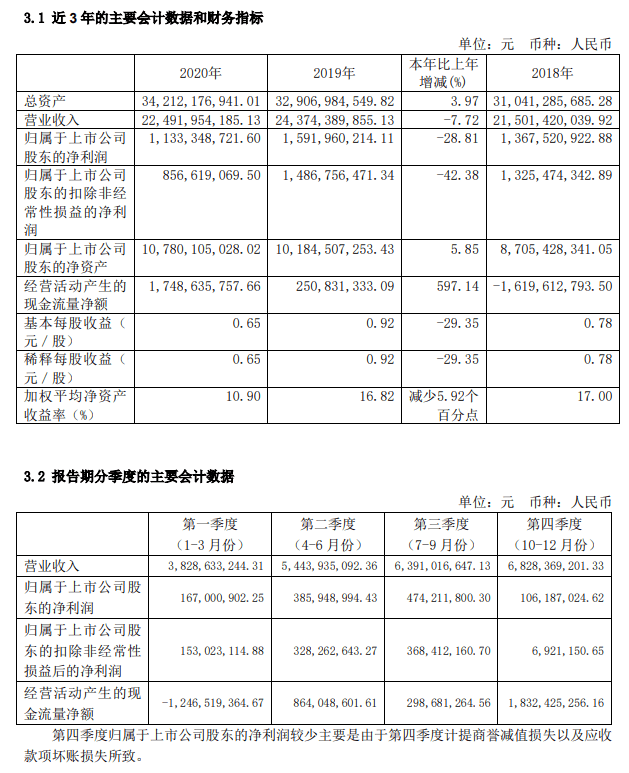 日前,中材國際(600970.SH)2020年年度報(bào)告,實(shí)現(xiàn)營業(yè)收入224.92億元,同比減少7.72%;歸屬于上市公司股東的凈利潤11.33億元,同比減少28.81%;歸屬于上市公司股東的扣除非經(jīng)常性損益的凈利潤8.57億元,同比下降42.38%;基本每股收益0.65元,擬每10股派發(fā)現(xiàn)金紅利2.3元(含稅)。
