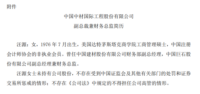 汪源:女,1976年7月出生,美國達(dá)特茅斯塔克商學(xué)院工商管理碩士,中國注冊(cè)會(huì)計(jì)師協(xié)會(huì)的非執(zhí)業(yè)會(huì)員。曾任中國建材股份有限公司財(cái)務(wù)部副總經(jīng)理,中國巨石股份有限公司副總經(jīng)理兼財(cái)務(wù)總監(jiān)。