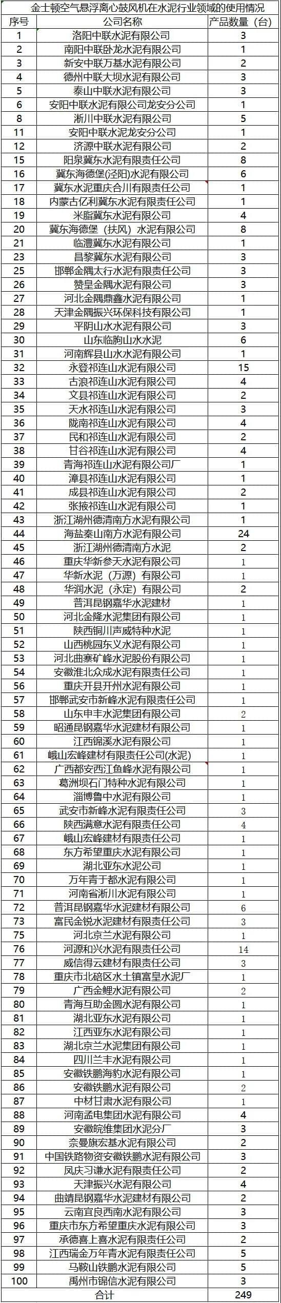 自金隅太行成功的使用了兩臺空氣懸浮風(fēng)機(jī)后,更多的水泥企業(yè)開始嘗試使用金士頓空氣懸浮風(fēng)機(jī)。據(jù)水泥人網(wǎng)不完全統(tǒng)計(jì),截止目前水泥行業(yè)領(lǐng)域共有249臺金士頓空氣懸浮風(fēng)機(jī)投入使用,金隅冀東,祁連山水泥,山水水泥,南方水泥,中聯(lián)水泥,東方希望水泥,華新水泥,昆鋼嘉華,曲寨水泥,京蘭水泥、亞東水泥等均有上線金士頓空氣懸浮風(fēng)機(jī)。