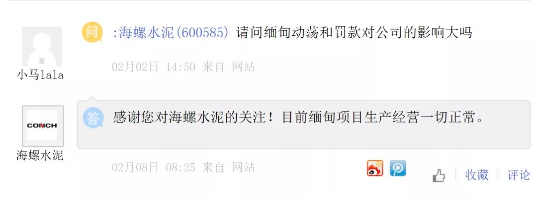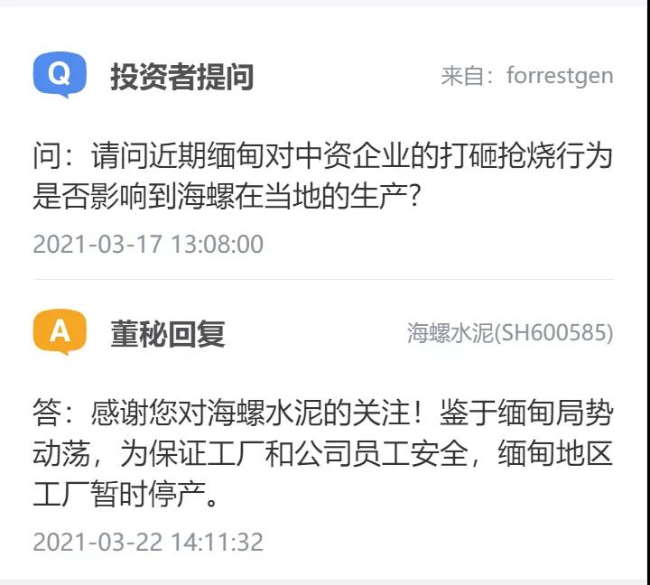 今年2月初,就有投資者在上市平臺向海螺水泥董秘提問緬甸動蕩和罰款對公司的影響。海螺水泥回答稱,緬甸項目生產(chǎn)經(jīng)營一切正常。
