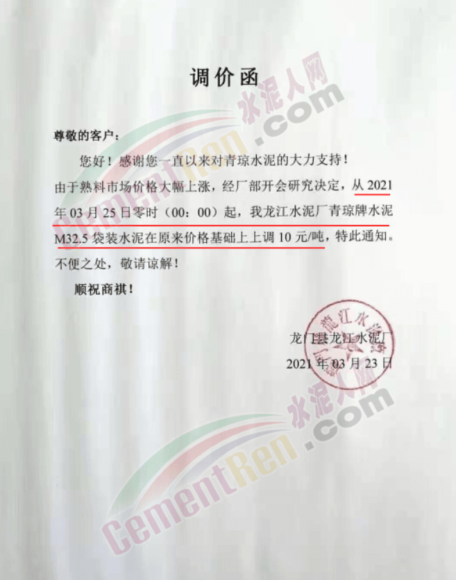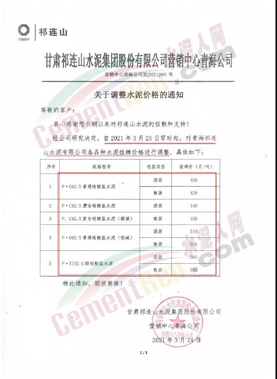 近期,因市場原因,經(jīng)研究決定,自2021年3月26日零時起,各品種散、袋水泥在原有價格基礎(chǔ)上上調(diào)30元/噸。