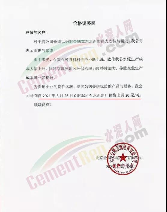 金隅冀東水泥(唐山)有限責(zé)任公司營銷分公司通知,由于企業(yè)環(huán)保投入、原材料成本不斷增加,致使水泥成本不斷提高。為保證企業(yè)正常運營,對水泥的出廠價格進行調(diào)整,自2021年3月25日14時起,天津地區(qū)各品種散裝水泥和袋裝水泥出廠價格在原價格基礎(chǔ)上上調(diào)20元/噸。