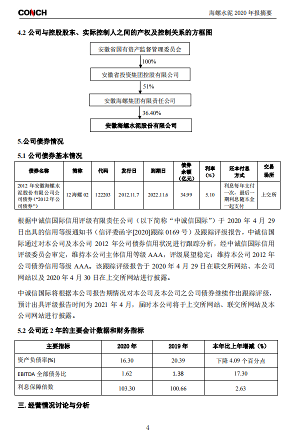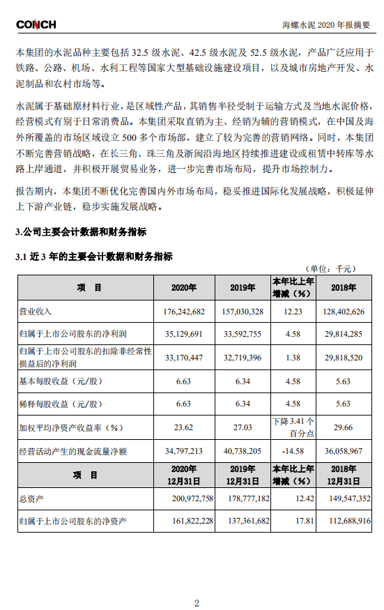 海螺水泥(600585)25日晚間發(fā)布年報(bào),2020年實(shí)現(xiàn)營(yíng)業(yè)總收入1762.43億元,同比增長(zhǎng)12.23%;歸屬母公司股東凈利潤(rùn)351.3億元,同比增長(zhǎng)4.58%;基本每股收益為6.63元。