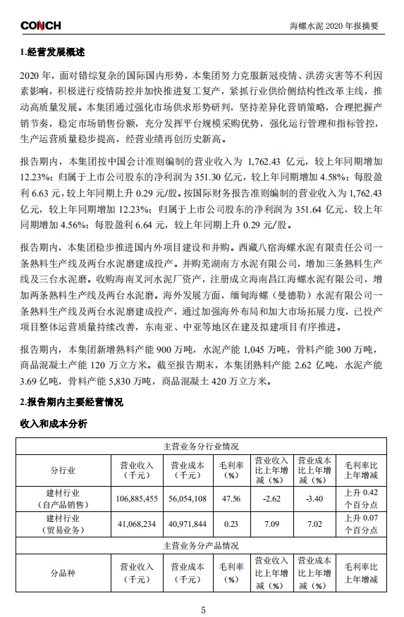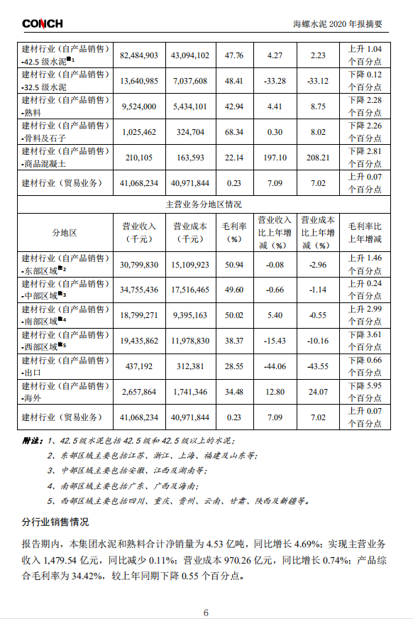 報(bào)告期內(nèi),本集團(tuán)水泥和熟料合計(jì)凈銷量為4.53億噸,同比增長(zhǎng)4.69%;實(shí)現(xiàn)主營(yíng)業(yè)務(wù)收入1,479.54億元,同比減少0.11%;營(yíng)業(yè)成本970.26億元,同比增長(zhǎng)0.74%;產(chǎn)品綜合毛利率為34.42%,較上年同期下降0.55個(gè)百分點(diǎn)。