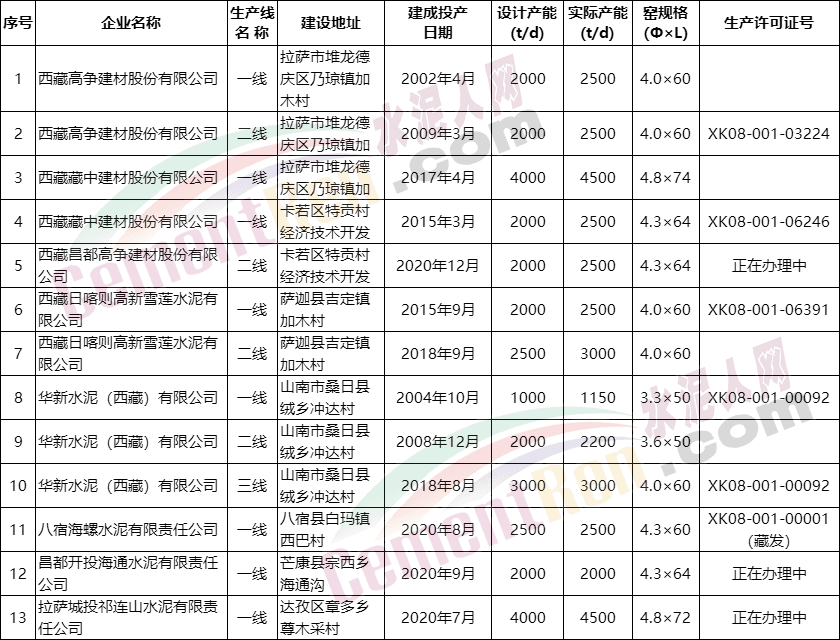 西藏自治區(qū)水泥熟料生產(chǎn)線清單