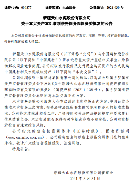 公司近期收到中國建材的通知,獲悉其收到國務(wù)院國資委下發(fā)的《關(guān)于新疆天山水泥股份有限公司資產(chǎn)重組及配套融資有關(guān)事項(xiàng)的批復(fù)》,國務(wù)院國資委原則同意本次交易正式方案。