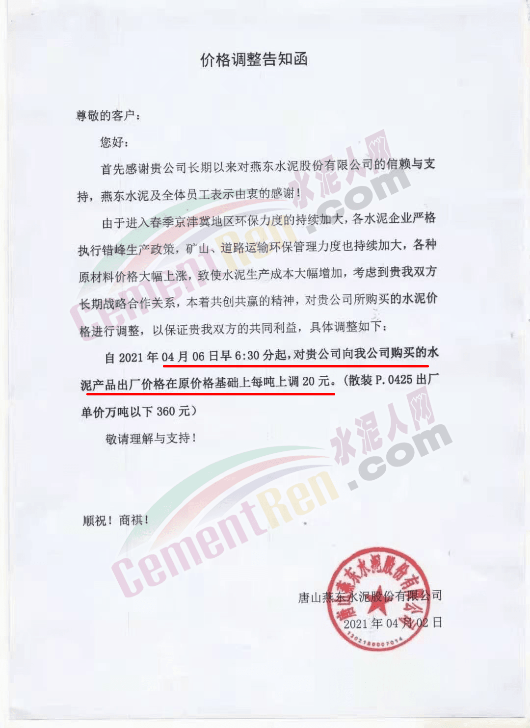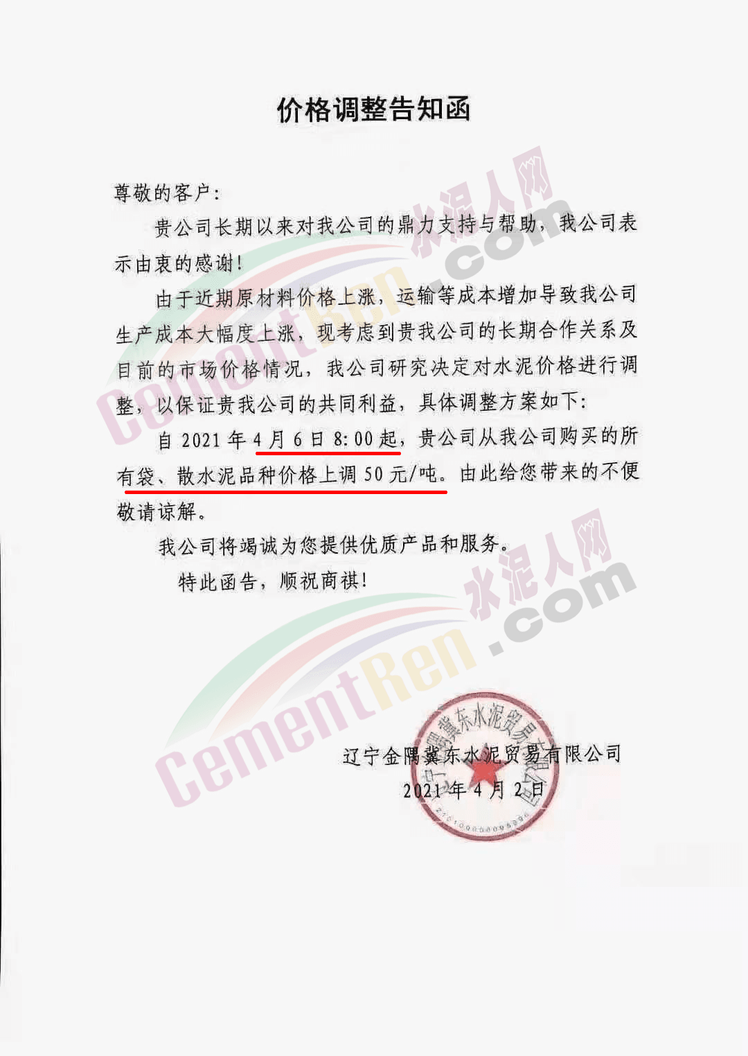 尊敬的客戶:根據(jù)目前市場行情,經(jīng)公司研究決定,自2021年4月8日零時(shí)起我司發(fā)往各區(qū)域的各品種各型號(hào)水泥出廠單價(jià)上調(diào)40元/噸 。
